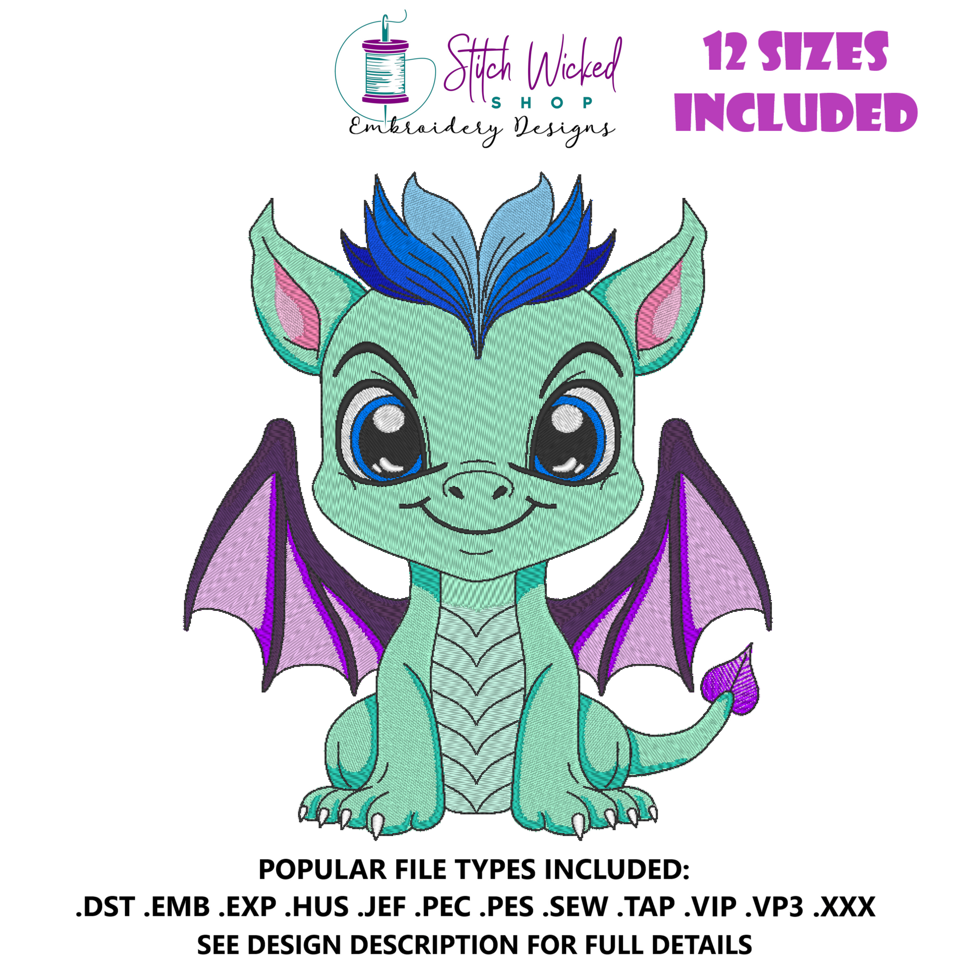 Stitch this cute adorable baby dragon for all your embroidery projects. This design would stitch out perfectly on any type of embroidery surface. The design is included in 12 sizes and would be a great addition to any piece of clothing be it a jacket or bag, to things like tea towels and home decor.