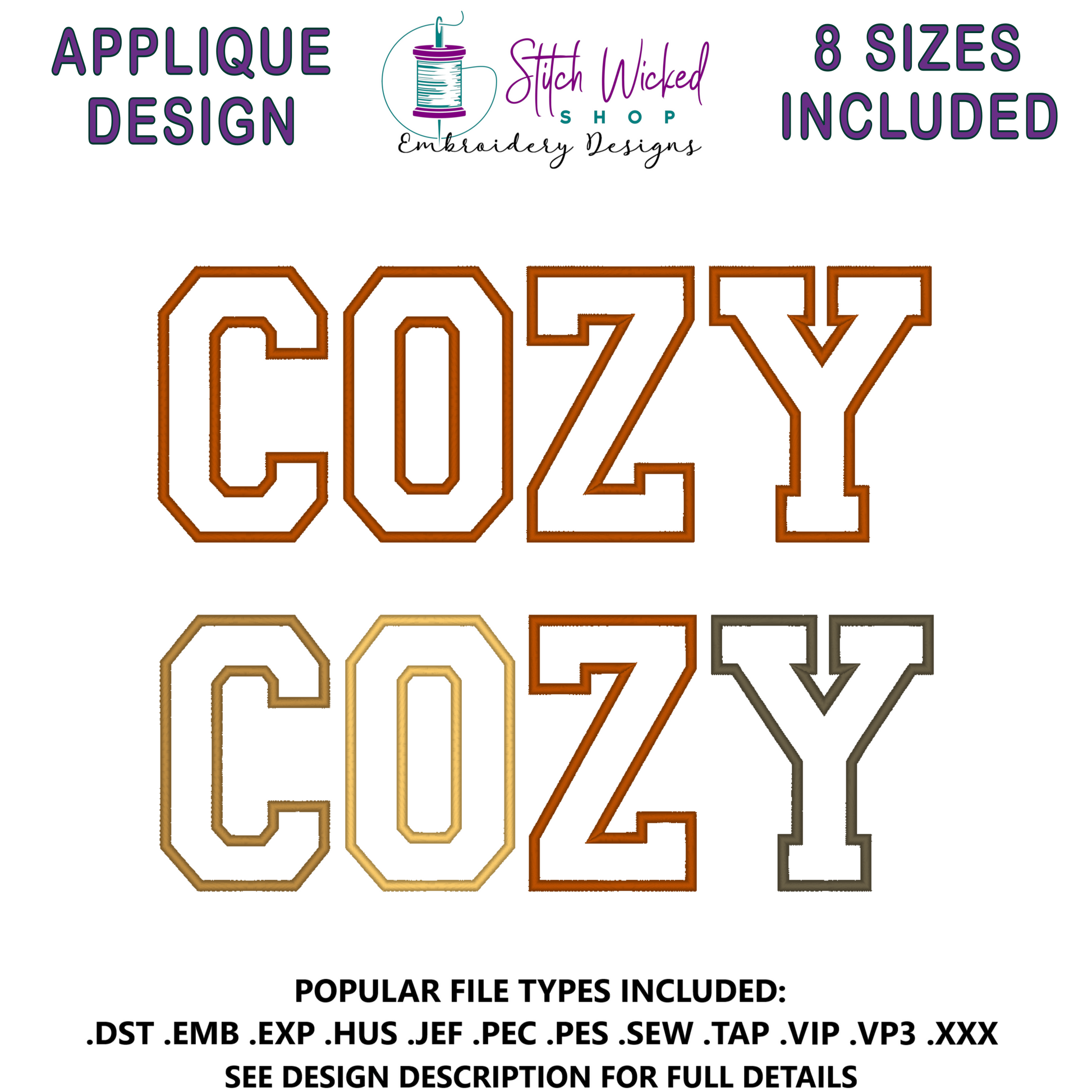 🍂 Add a touch of cozy autumn vibes to your projects with this varsity-style "COZY" applique embroidery design! Perfect for sweatshirts, hoodies, and home decor, this design comes in 8 sizes and includes both single-color and multi-color options. Ideal for fall stitching, pumpkin spice season, and snugly days.