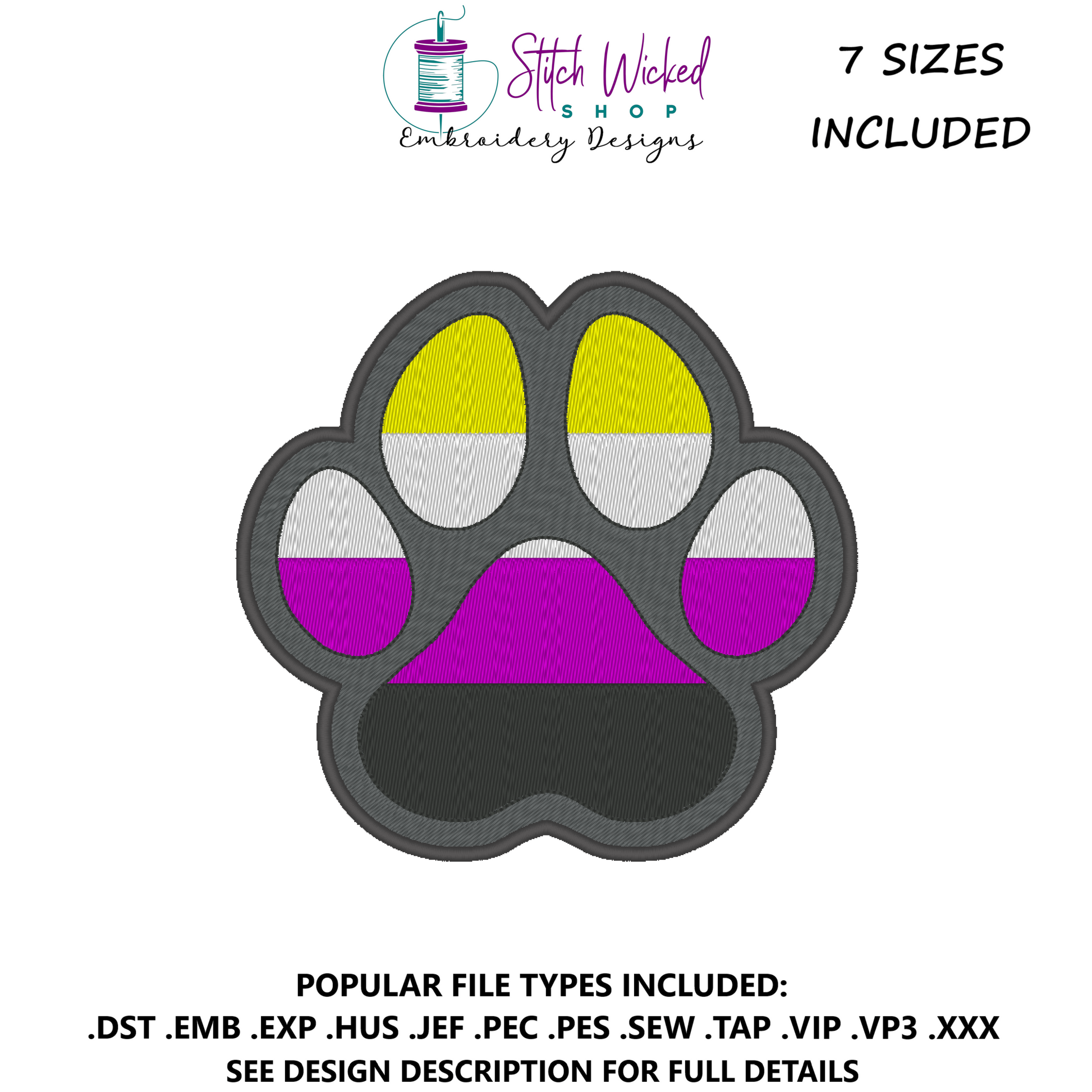 Stitch this beautiful nonbinary pride flag paw design on any type of embroidery surface. With 7 sizes included, they make great patches or would be a wonderful addition directly embroidered to any piece of clothing be it a jacket, bag, or hat, to things like tea towels and hoodies.